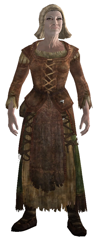 Hilde is an unpleasant old woman who lives with her son, Sven in a house in the village of Riverwood. She thinks her son is the greatest thing since sliced bread, and is quite a racist as well. She will rant about how lizards (Argonians) and elves are overrunning her native Skyrim. When the Dragonborn first arrives in Riverwood, she can be overheard talking about a dragon she saw pass her house, her son thinks she is crazy.
