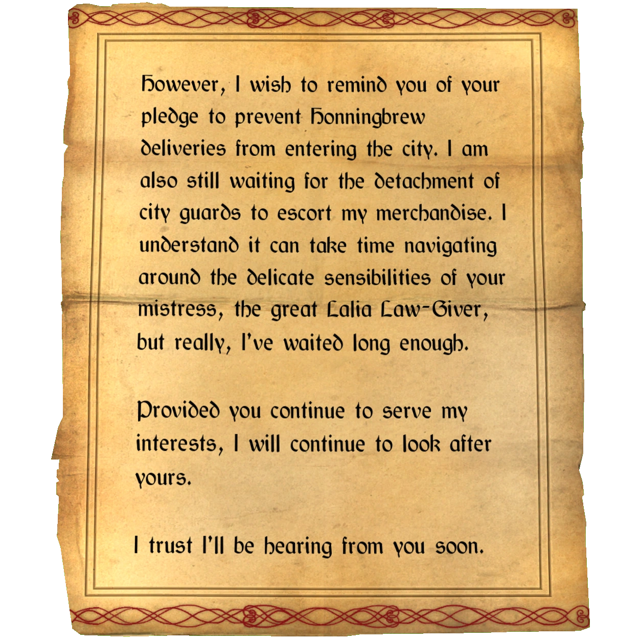 “The Jarl has shown great wisdom in choosing you as his or her Steward. A position well befitting your character, as it demands great cunning, grace, and, shall we say, a decided talent for performing one's duties tactfully and with much discretion. The Jarl wasn't acting in the hold's best interest by turning down my gracious offer. But you were able to see past the Jarl's short-sightedness. In the end, I'm quite sure the Jarl will thank you for your cleverness in this matter. I am in your debt. Commensurate with your continued cooperation, I grant you a boon. It is only a matter of time before our efforts bear fruit.