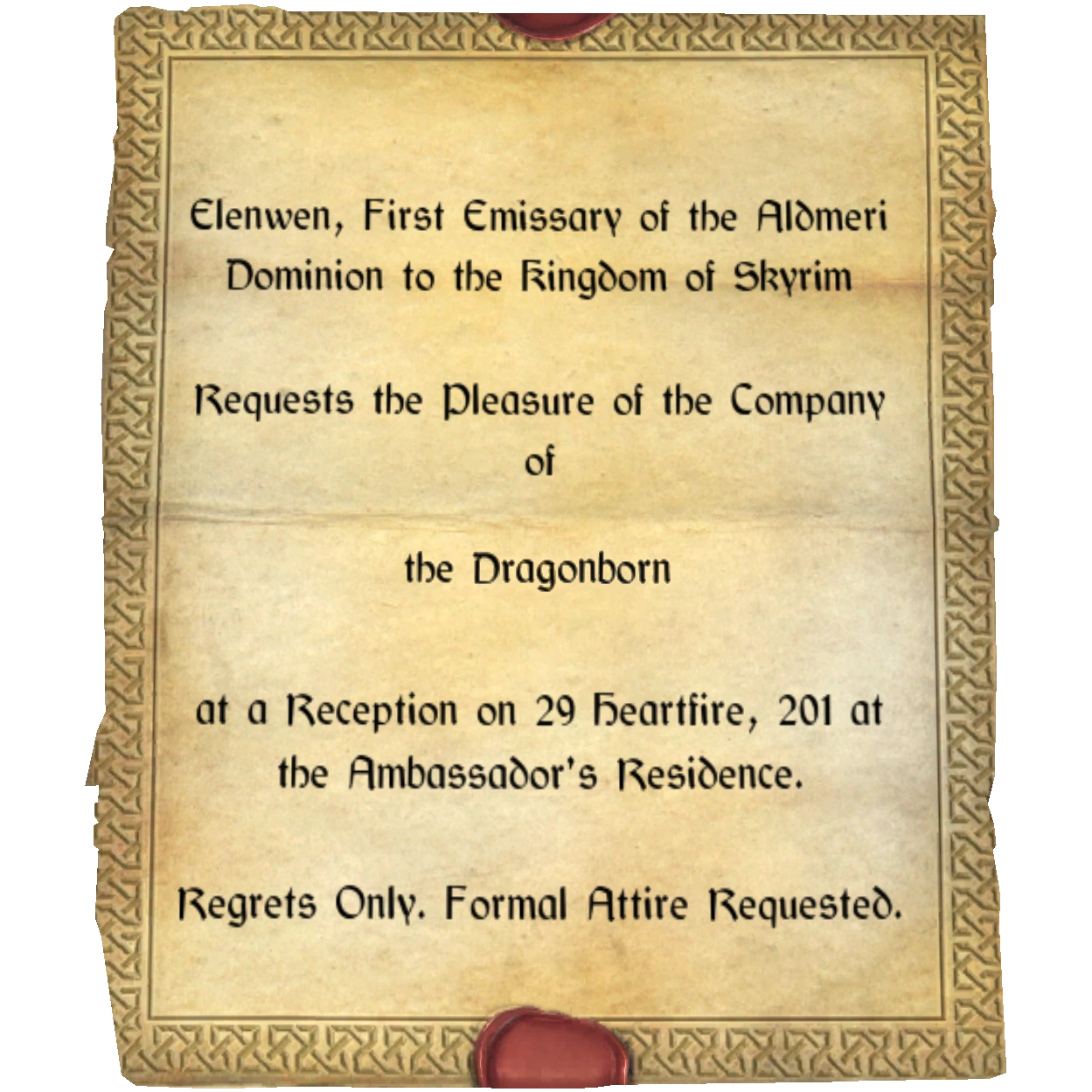 Invitation to permit access to the reception at the Thalmor Embassy. The date on the invitation varies depending on the player's progress in the game.
