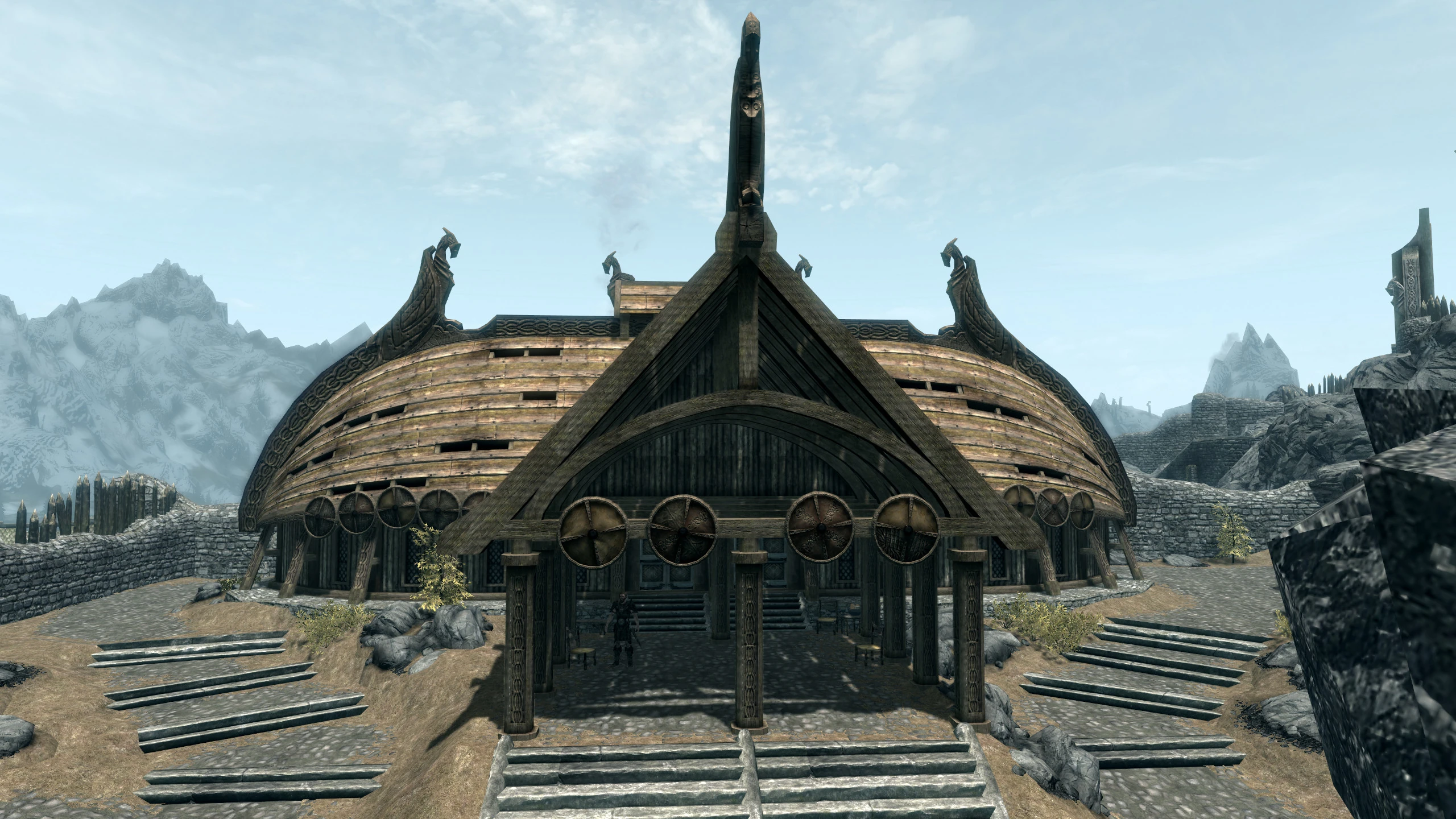 Jorrvaskr is the headquarters of the mercenary guild known as The Companions. This loose association of private soldiers has for many generations lived, trained and celebrated in this historic structure composed primarily of an up-ended warship. It is located in the city of Whiterun in central Skyrim, by an ancient construct known as the Skyforge.