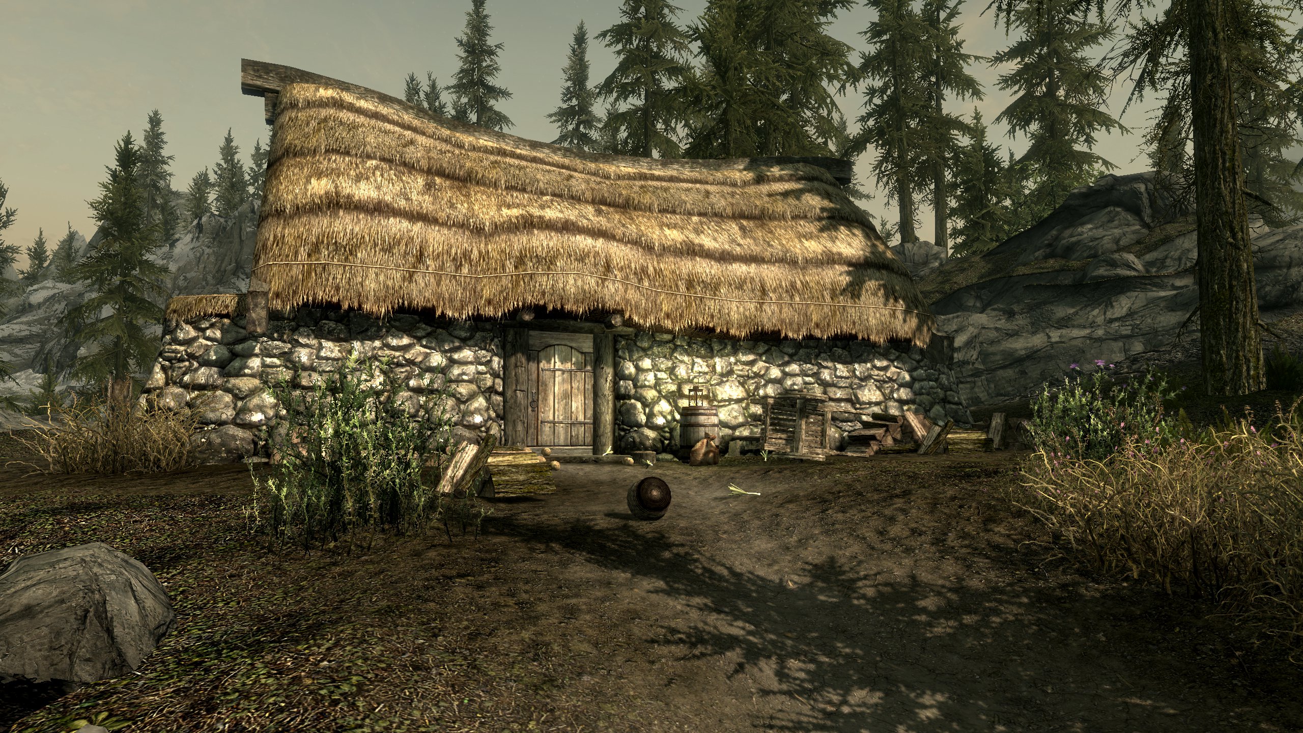 At first glance, Pinewatch just appears to be a small cabin with wood chopping block, a small garden of leeks and potatoes. But there is a large underground complex, accessible from the cellar, guarded by a lone bandit. Also in the cellar are two Sabre Cat Pelts, a cooking pot, a bed and The Song of Pelinal, v8. Along the wall facing the fireplace is a bookcase, and immediately to the right of that bookcase is a button which causes the bookcase to swing out revealing the cave system (a Note to Rhorlak hints at the passage). And the Warning note does not bode well for trespassers.