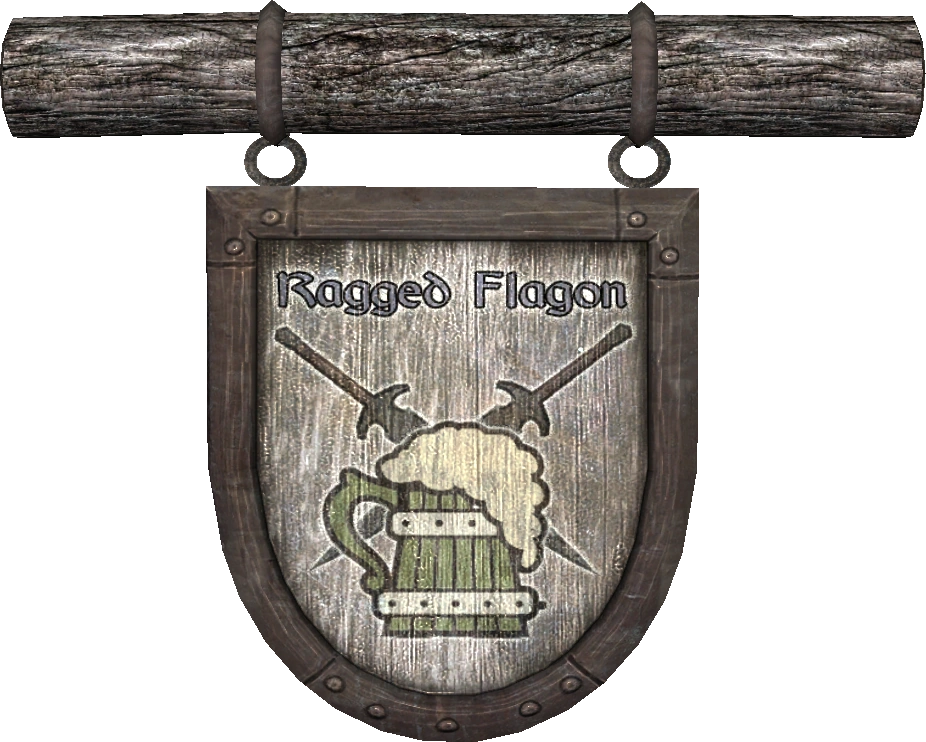 The Ragged Flagon is a pub located beneath Riften in the Ratway. It is used as a base of operations by the Thieves' Guild and used to be a bustling place of commerce when the Guild was in its heyday. It has since fallen into a bit of disrepair after the Guild started losing its fortunes.